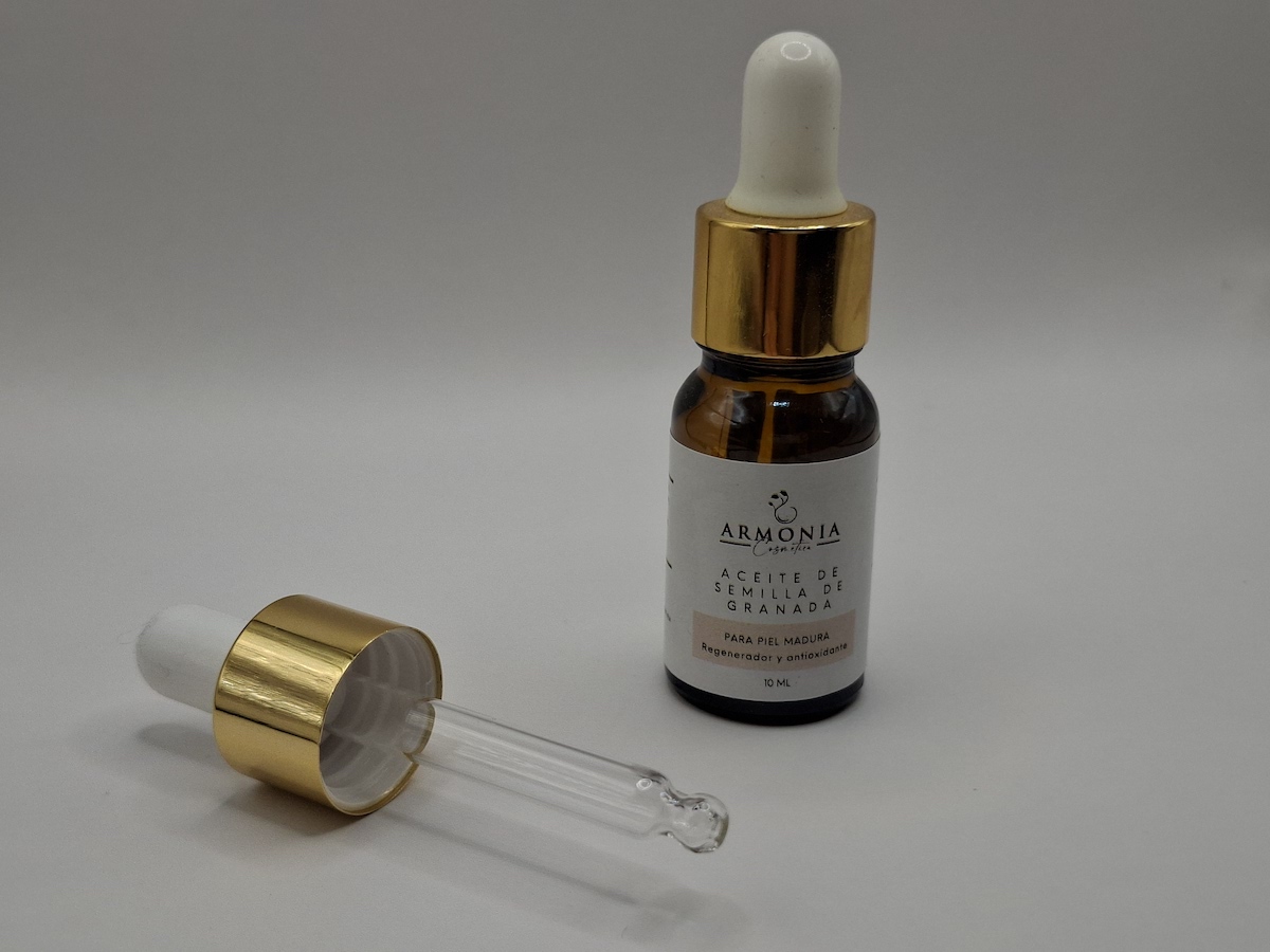 El aceite de semilla de granada es un poderoso antioxidante que combate el envejecimiento prematuro, hidrata profundamente y mejora la elasticidad de la piel. Ideal para pieles secas o maduras, protege y revitaliza, dejando una piel más firme y luminosa.